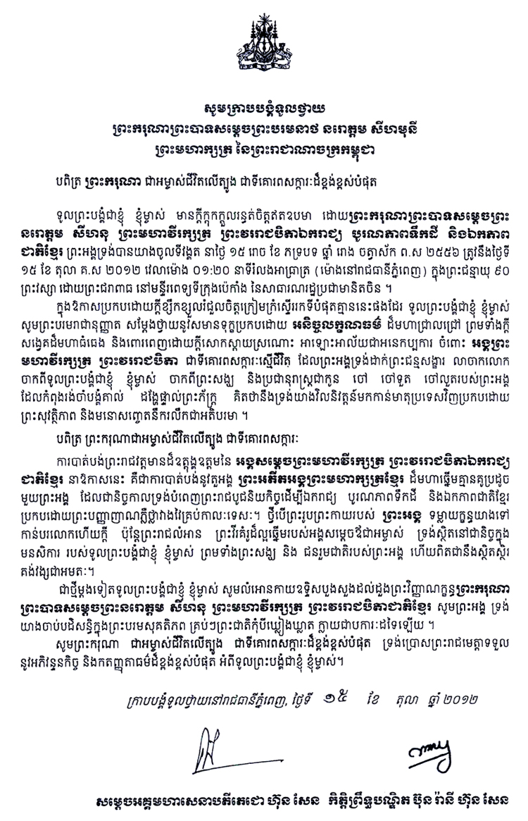 Correspondance Chefs d’Etat » 2012 » Novembre » Lettre de SE Akka Samdech et Lok Chumtiev thom