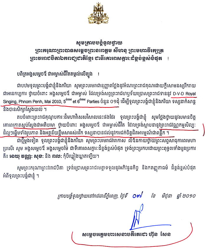 Correspondance Chefs d’Etat » 2010 » Juin » Remerciements de SE Akka Samdech Hun Sen à SM le
