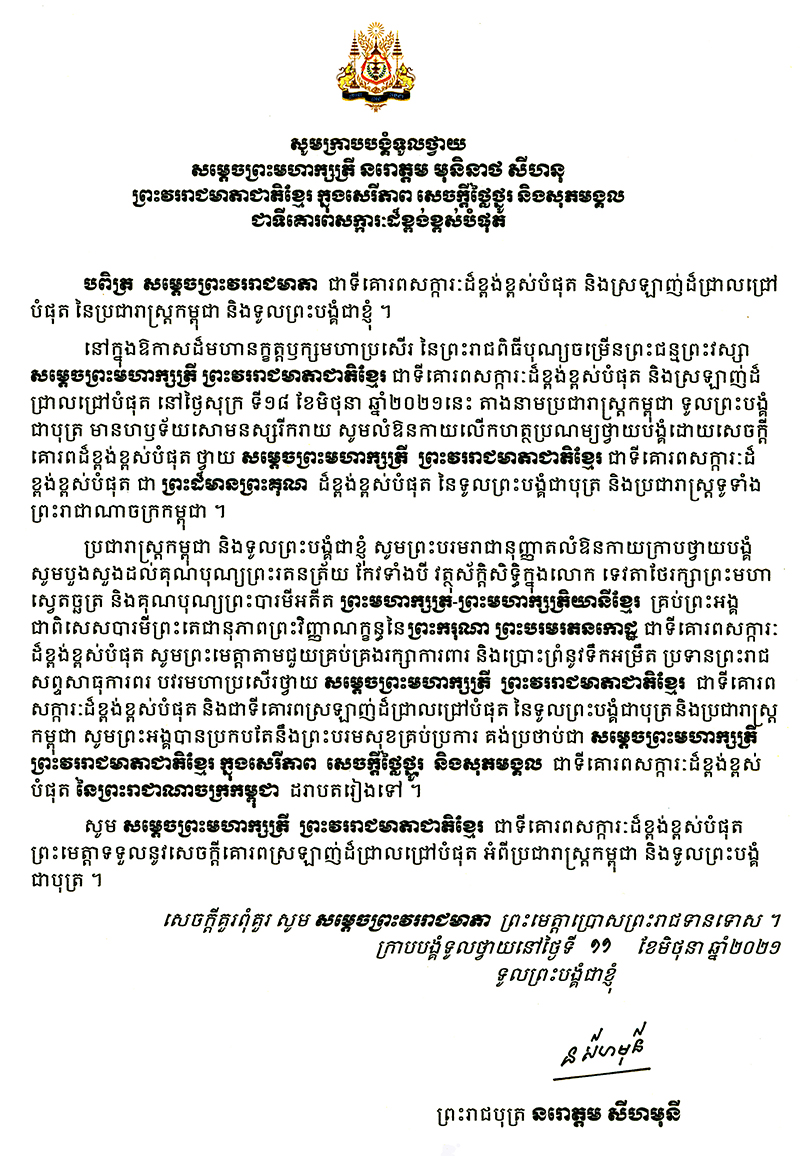 Correspondance Chefs d’Etat » 2021 » Juin » Voeux de SM Norodom Sihamoni, Roi du Cambodge, à